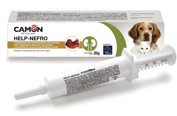 Mangime complementare dietetico per cani e gatti, a base di estratti vegetali, funghi e vitamine, sviluppato per mantenere la fisiologica funzionalità renale dell'animale. Help-Nefro agisce come coadiuvante nel mantenimento del normale stato fisiologico delle alte vie urinarie soprattutto in corso di insufficienza renale. Contiene cordyceps, reishi, garcinia mangostana, gingko biloba e olea europea, oltre a olio di lino e olio di pesce, importanti fonti di omega 3 e omega 6.